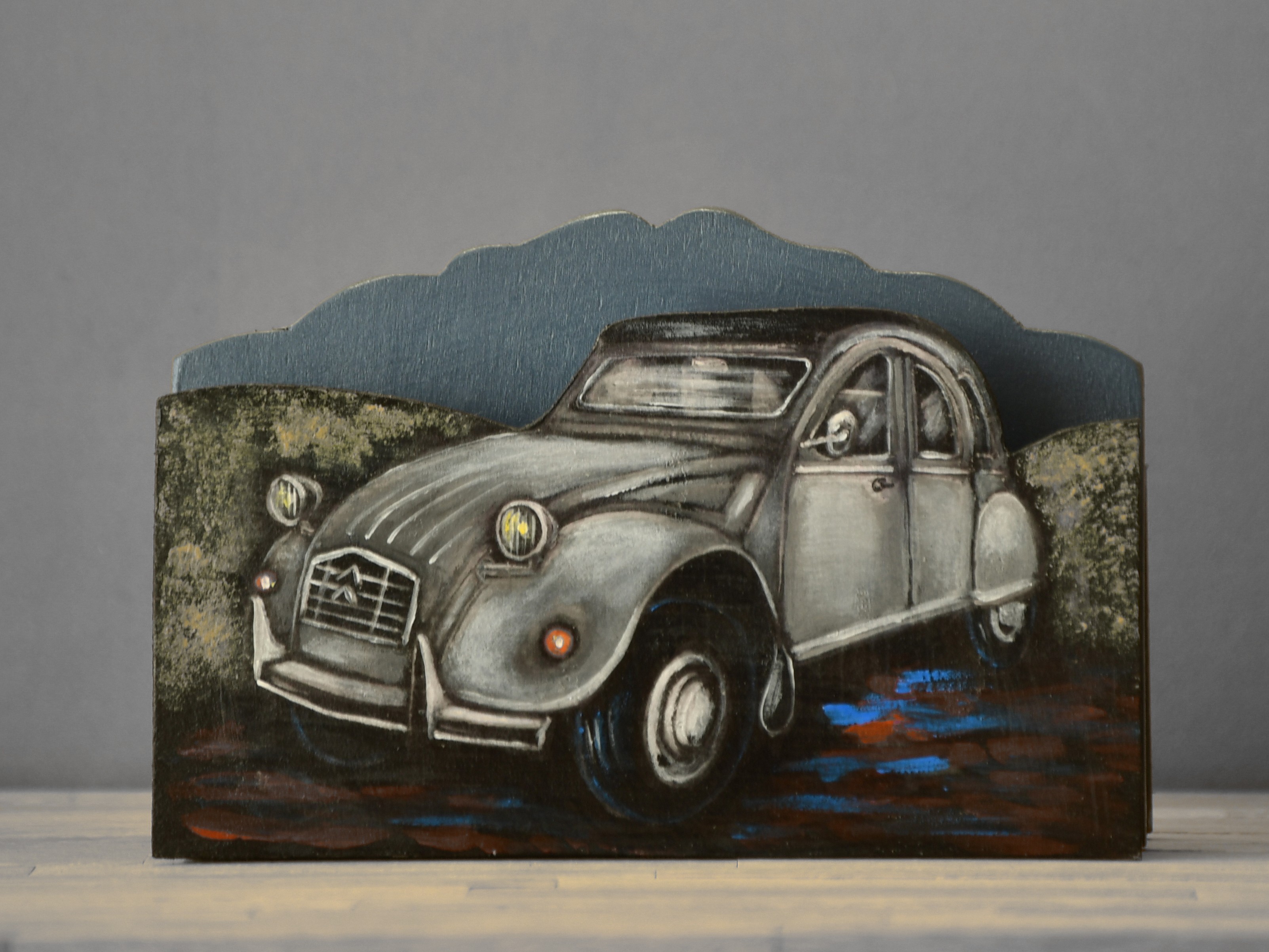 2 CV Citroen grise, support gris foncé